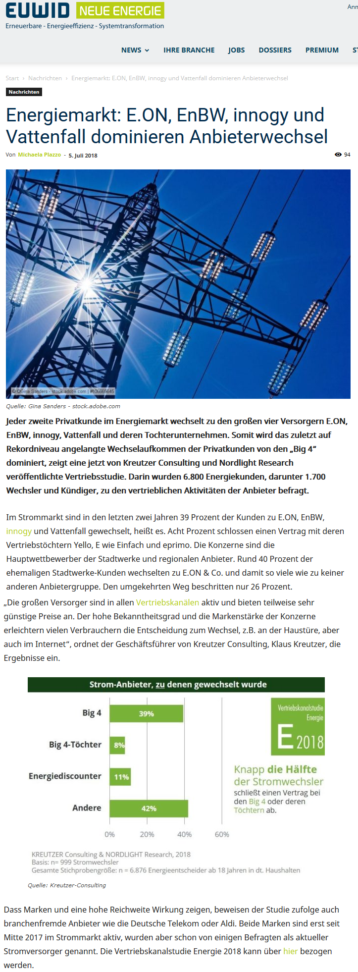 Artikel über die Ergebnisse der Vertriebskanalstudie Energie 2018 im Branchen-Nachrichtendienst "euwid energie", 05.07.2018. Link zum Artikel.