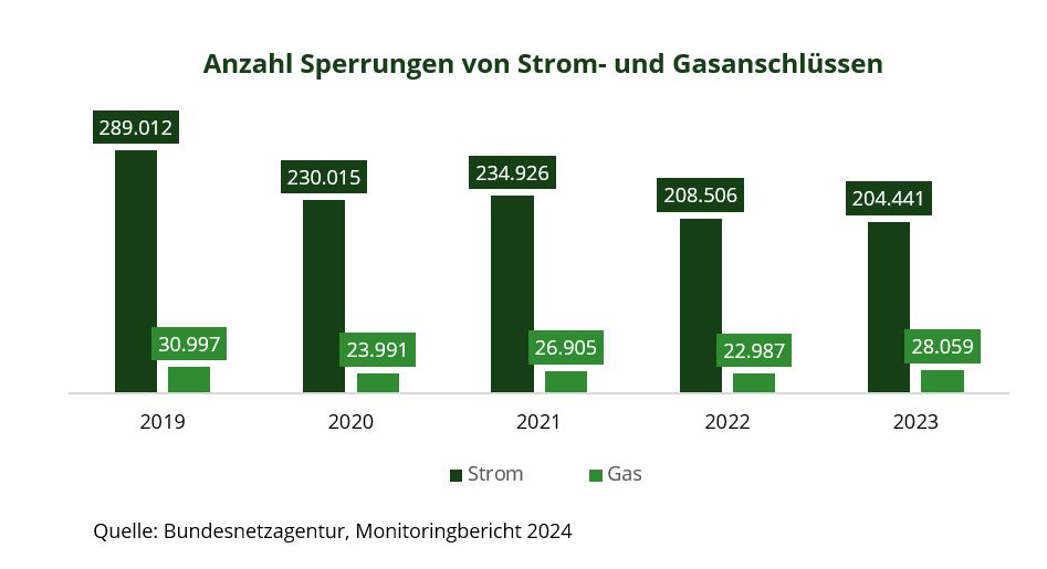 Auch im Hinblick auf drohende Zahlungsausfälle vor dem Hintergrund vermehrter Insolvenzen und überdurchschnittlich vielen betroffenen Angestellten gewährt der aktuelle Monitoringbericht Einblicke: Trotz Energiepreiskrise und einem stark gestiegenen Preisniveau nahmen die jährlich vorgenommen Stromsperrungen seit 2019 um jährlich knapp 7 % und die jährlich vorgenommenen Gassperrungen um knapp 2 % ab.